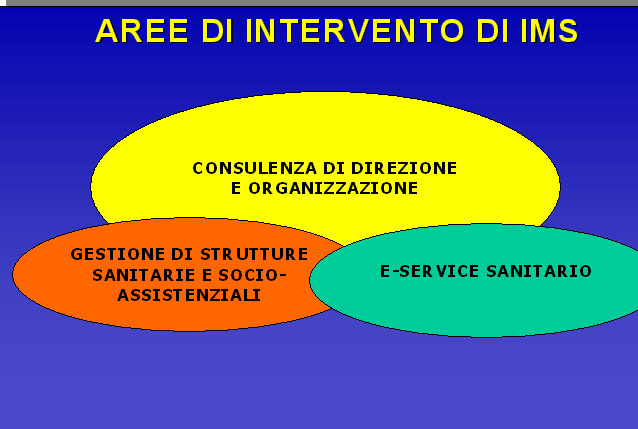 I.M.S. opera esclusivamente nel settore sanitario e socio assistenziale, nell'ambito delle aree della Consulenza di Direzione e della Organizzazione gestionale globale di strutture sanitarie e socio assistenziali e della Gestione esternalizzata di funzioni a supporto del processo clinico-sanitario.